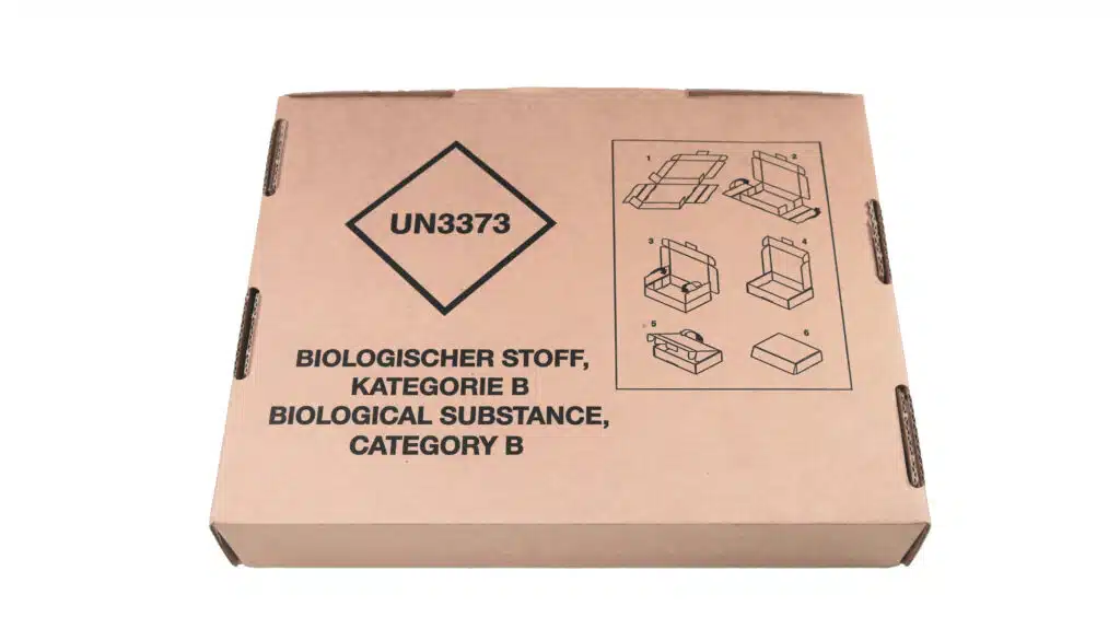 - Zwei Etiketten liegen dem Kit bei – Kennzeichnung für infektiöse Substanzen der Klasse 6.2 und UN3373; diese sind je nach Art der transportierten Probe auf der Umverpackung anzubringen