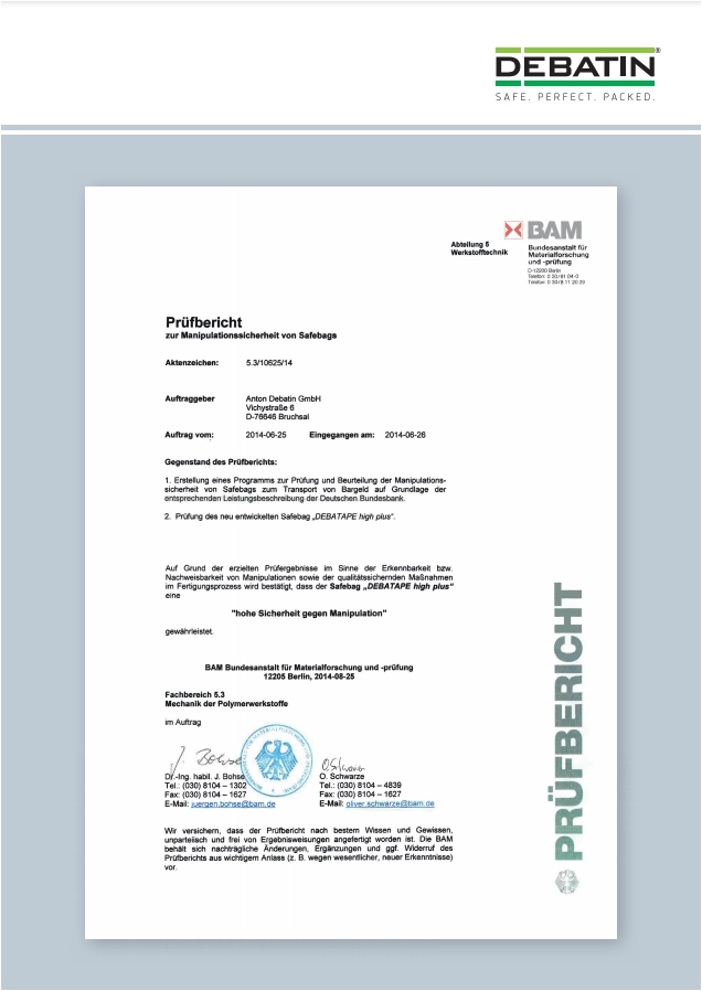 Der mit einem Wärme-Indikator ausgestattete, patentierte und von der Bundesanstalt für Materialforschung und ‑prüfung (BAM) zertifizierte Siegelverschluss DEBATAPE high plus erfüllt allerhöchste Ansprüche und bietet 360°-Rundum-Schutz gegen Manipulation. Die einzigartige Verschlusslösung zeigt jegliche Manipulationsversuche zuverlässig visuell an und garantiert höchste Sicherheit.
