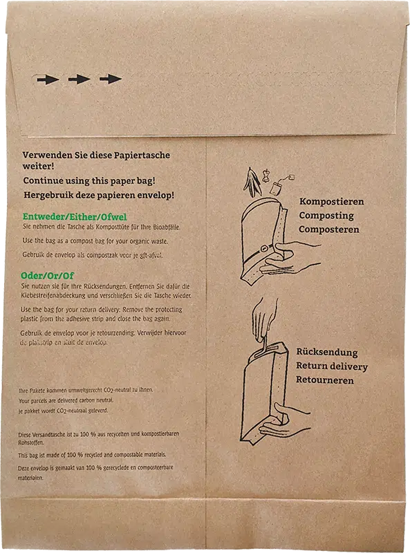 Konkret bedeutet dies: Die ISEGA (Industrie‑, Studien- und Entwicklungsgesellschaft) hat als akkreditiertes Labor und staatlich zugelassenes Forschungsinstitut für Papier, Karton und Lebensmittelverpackungen in einem Prüfzeugnis bestätigt, dass die Versandtasche DEBAPOST® Paper Second life durch Kompostierung und biologischen Abbau entsorgt werden darf. „Das war die Hürde, die unser Produkt nehmen musste, damit es in einem zweiten Leben nach dem als Versandtasche als Biomüllbeutel verwendet werden kann“, erläutert Thomas Rose. Damit dies auch tatsächlich ohne unerwünschte „Nebenwirkungen“ und mit gutem Gewissen geschehen kann, sind auch die Druckfarben auf der zu 99 % aus reißfestem Recyclingpapier bestehenden Versandtasche lösungsmittelfrei und wasserbasiert.